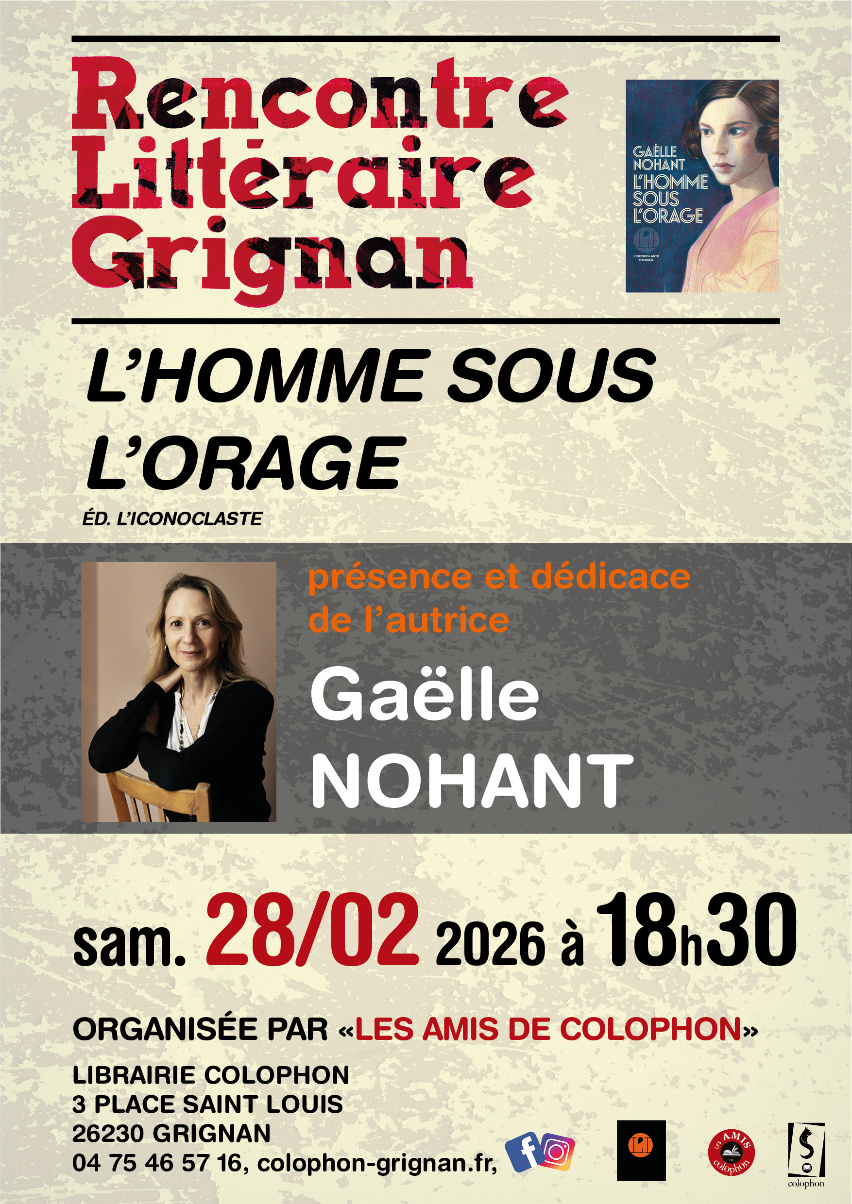 – Une librairie : un secteur adulte, un secteur jeunesse… la part belle est faite aux petites éditions et perles rares… on trouve aussi un large rayon Littérature et Polar. Tous les mois environ une rencontre littéraire est organisée par l’Association « Les Amis de Colophon ». Un auteur y est invité pour parler de son dernier ouvrage autour d’une discussion. Chaque année se déroule également « Le Festival du deuxième roman Grignan ». Un événement préparé tout au long de l’année. Un comité de lecture parcourt les deuxièmes romans parus dans l’année, puis sélectionne quatre ouvrages. Les quatre auteurs seront invités le temps d’un week-end pour des lectures, tables rondes, cafés littéraires… Un prix est remis à l’issue du Festival.