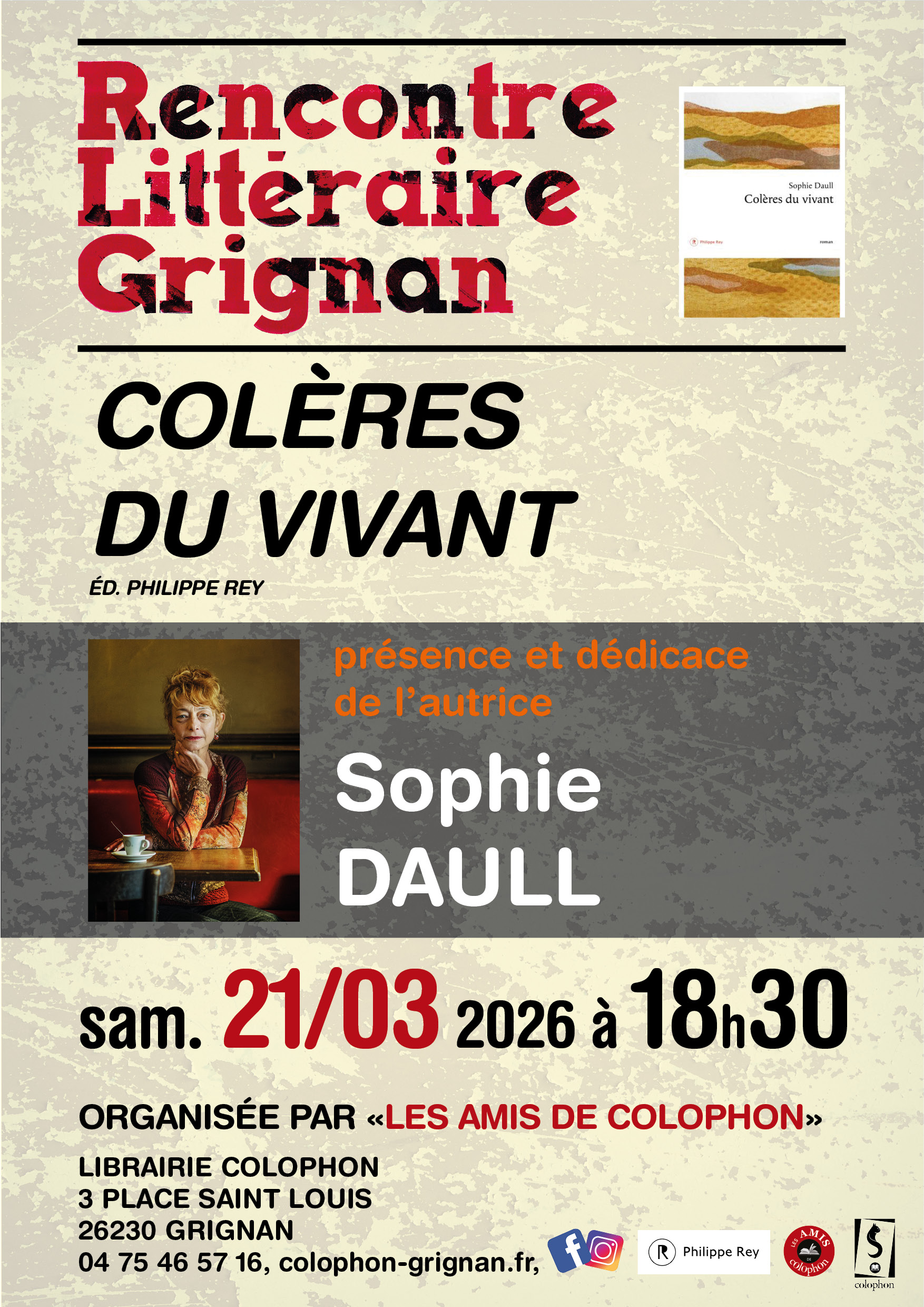 RENCONTRE AVEC ROBERT PEPIN SAMEDI 22 FEVRIER A 18h30 ROBERT PEPIN RACONTE SOUVENIR D’ENFANCE SUIVI D’UNE DISCUSSION SUR LE METIER D’EDITEURRENCONTRE EN PRESENCE DE TIMOTHEE DEMEILLERS SAMEDI 29 MARS A 18h30 ANIMEE PAR BRUNO MABILLERENCONTRE EN PRESENCE DE CHRISTIAN ASTOLFI SAMEDI 5 AVRIL A 18h30 ANIMEE PAR CHANTAL BONNEMAISONLE THEATRE DE LA PIERRE PRESENTE LA PIECE SULKI ET SULKU de JEAN-MICHEL RIBES SAMEDI 19 AVRIL A 18h30 INTERPRETEE PAR FRANCK VIDAL et MICHEL VILLETTERENCONTRE EN PRESENCE DE MIGUEL BONNEFOY VENDREDI 25 AVRIL A 18h30 ANIMEE PAR DENIS BRUYANTL’écrivaine LUCILE BORDES en résidence. Toute la programmation de maiRENCONTRE EN PRESENCE DE LUCILE BORDESVENDREDI 30 MAI 18h30 Présidente du jury et marraine du Festival du 2e roman Grignan Discussion sur l’ensemble de on oeuvre, animée par DENIS BRUYANTPrésidente du jury et marraine du Festival LUCILE BORDES Délibérations du jury vendredi 30 mai à 16h – 18h30 Rencontre avec LUCILES BORDES ECRIVAINE.ES INVITE.ES ABIGAIL ASSOR/NICOLAS GARMA-BERMAN/ ALEXANDRE LENOT/MARIE VINGTRASSAMEDI 14 JUIN 18h30 HOMMAGE A PHILIPPE JACCOTTET1925-2025 Textes choisis par Bruno Mabille – Lectures par Sonia Boissin, Bruno Mabille et Evelyne Rimaux Guitare par Nicole Chaix et René Delcourt – Répertoire de musique ancienne irlandaiseRENCONTRE EN PRESENCE DE AURELIEN BELLANGER SAMEDI 5 JUILLET A 18h30 ANIMEE PAR DENIS BRUYANTRENCONTRE EN PRESENCE DE JEROME CHANTREAU DIMANCHE 13 JUILLET A 18h30 ANIMEE PAR CHANTAL BONNEMAISONRENCONTRE EN PRESENCE DE SANDRINE COLLETTE DIMANCHE 20 JUILLET A 18h30 ANIMEE PAR BRUNO MABILLERENCONTRE EN PRESENCE DE CAROLE MARTINEZ DIMANCHE 3 AOUT A 18h30 ANIMEE PAR DENIS BRUYANTRENCONTRE EN PRESENCE DE GERARD MORDILLAT SAMEDI 30 AOUT A 18h30 ANIMEE PAR YOAN MARTINEZRENCONTRE EN PRESENCE DE SYLVAIN PRUDHOMME VENDREDI 17 OCTOBRE A 18h30 ANIMEE PAR ADRIAN MEYRONNETRENCONTRE EN PRESENCE DE BRUNO MABILLE SAMEDI 1er NOVEMBRE A 18h30 ANIMEE PAR CHANTAL BONNEMAISON