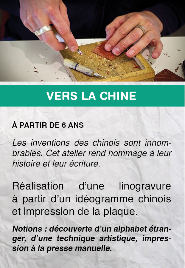 Réalisation d’une linogravure à partir d’un idéogramme chinois et impression de la plaque.
