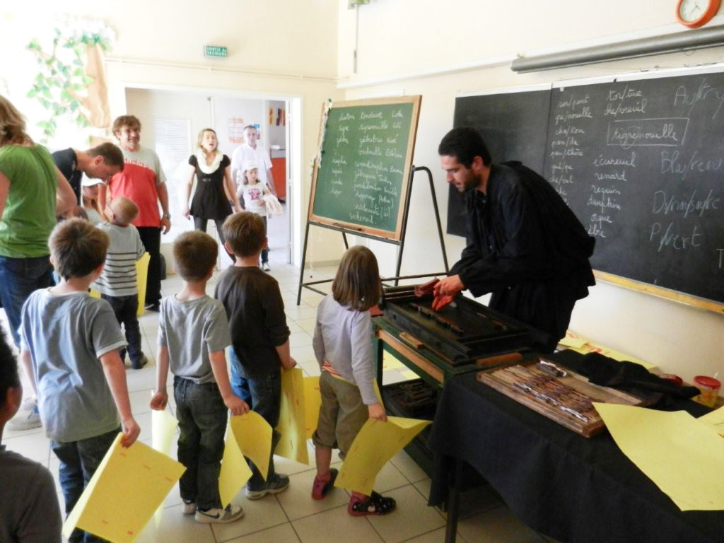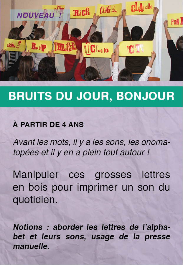 Notions : aborder les lettres de l’alphabet et leurs sons, usage de la presse manuelle.